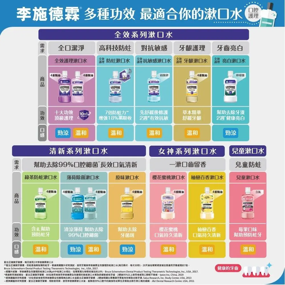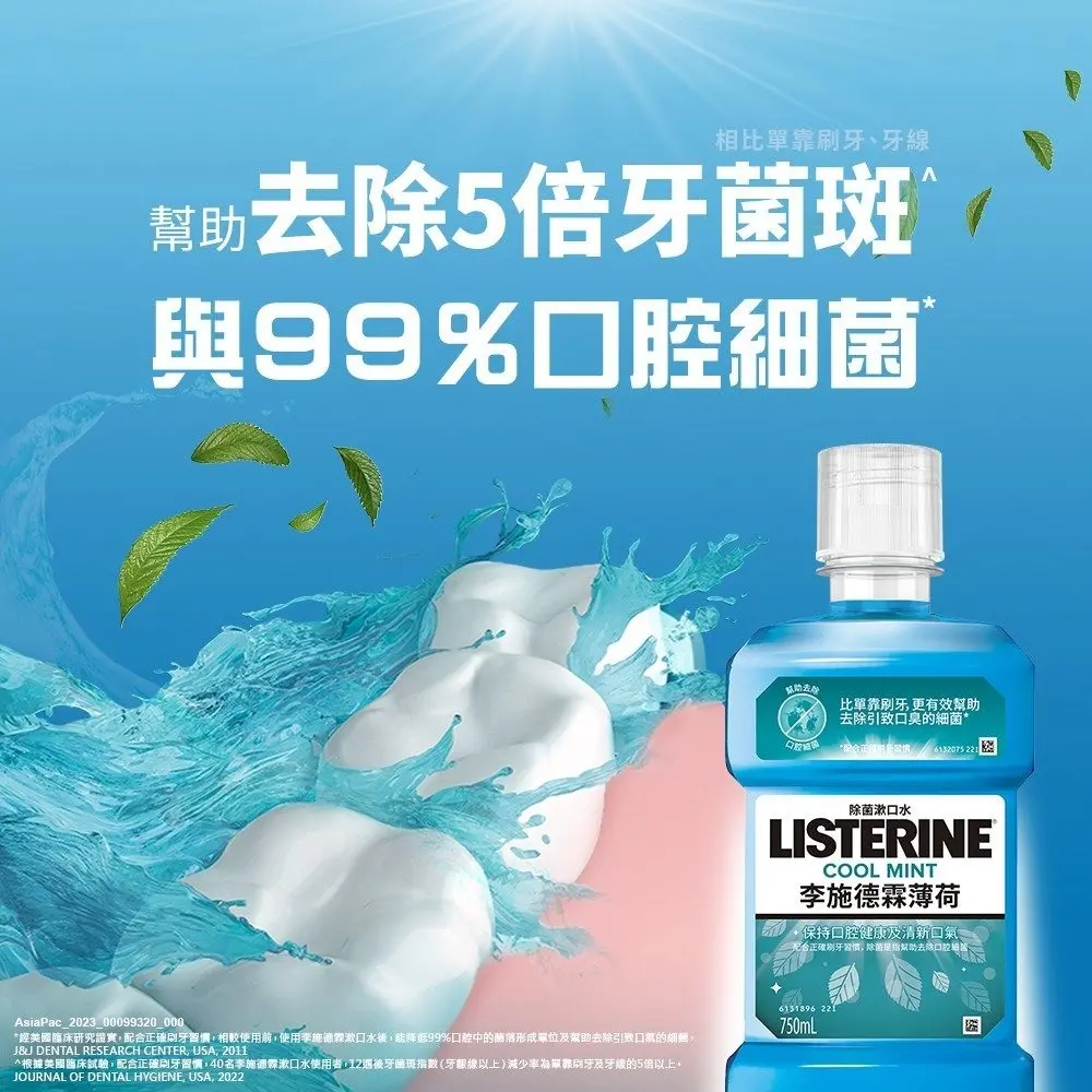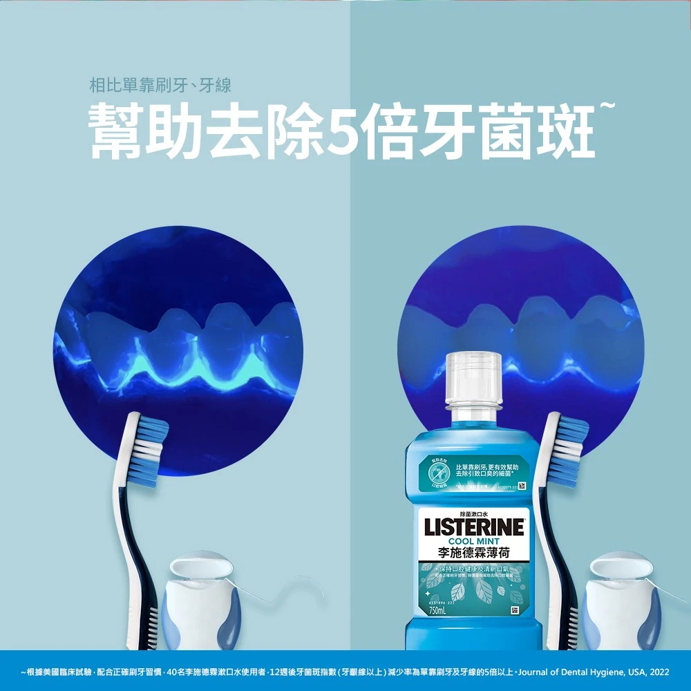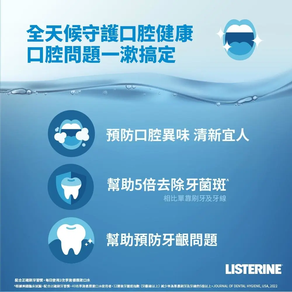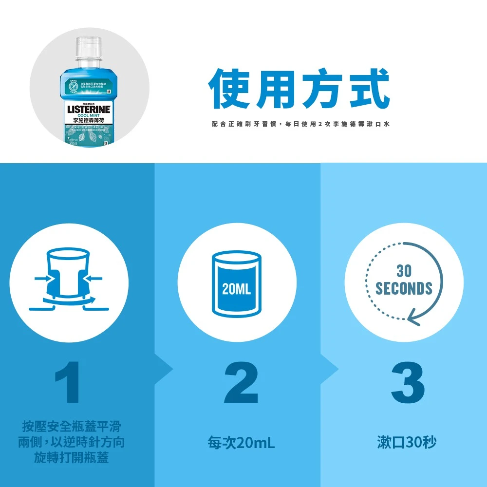 清爽沁涼薄荷口感每天早晚刷牙後使用,可全天候保護口腔全面潔淨比單靠刷牙和牙線有更好的除菌效果特有的4種精油配方,能深入口腔幫助去除牙菌斑,長效清新口氣適合12歲以上兒童及成人天天使用