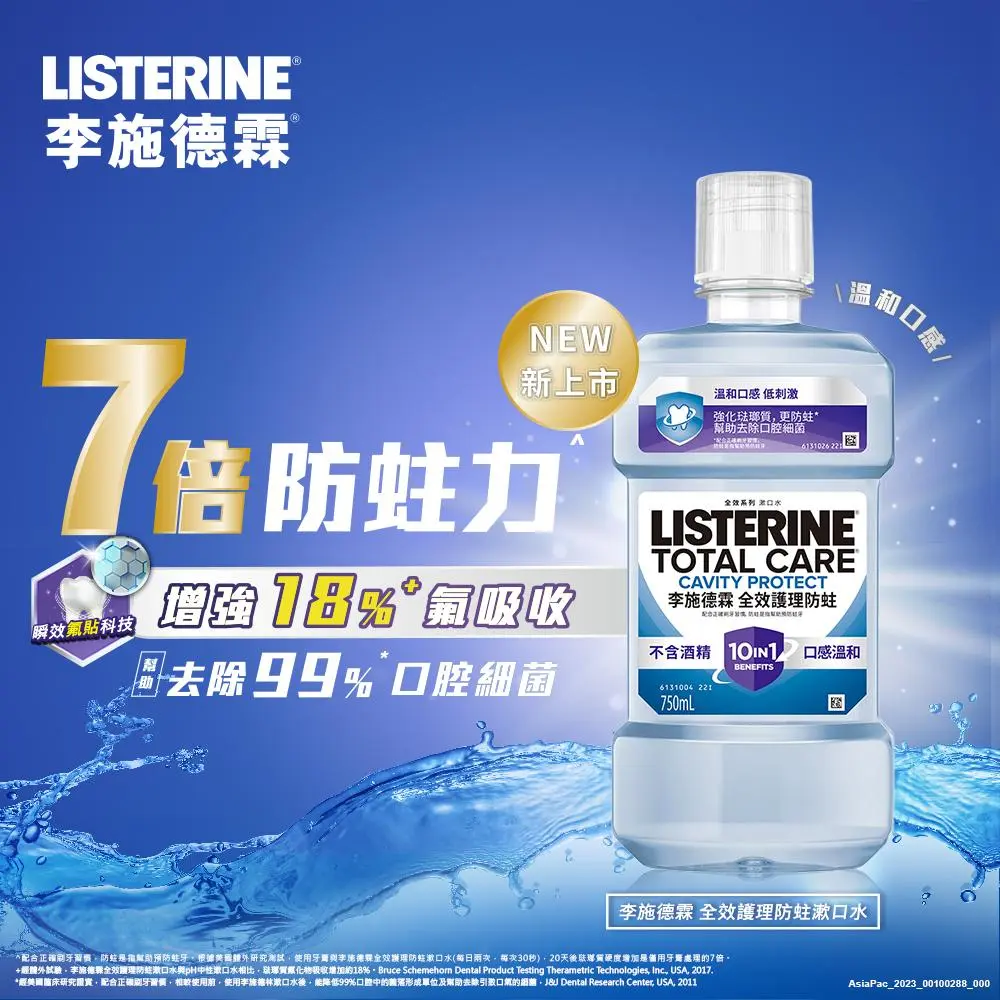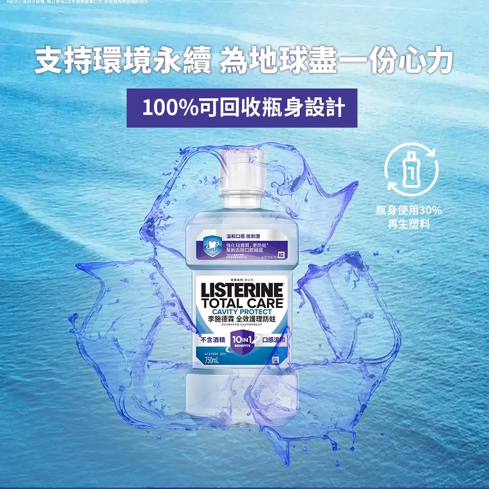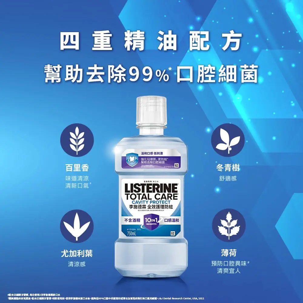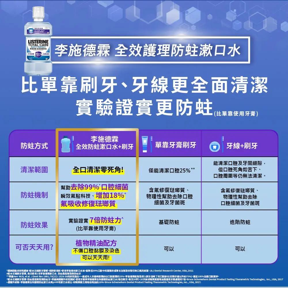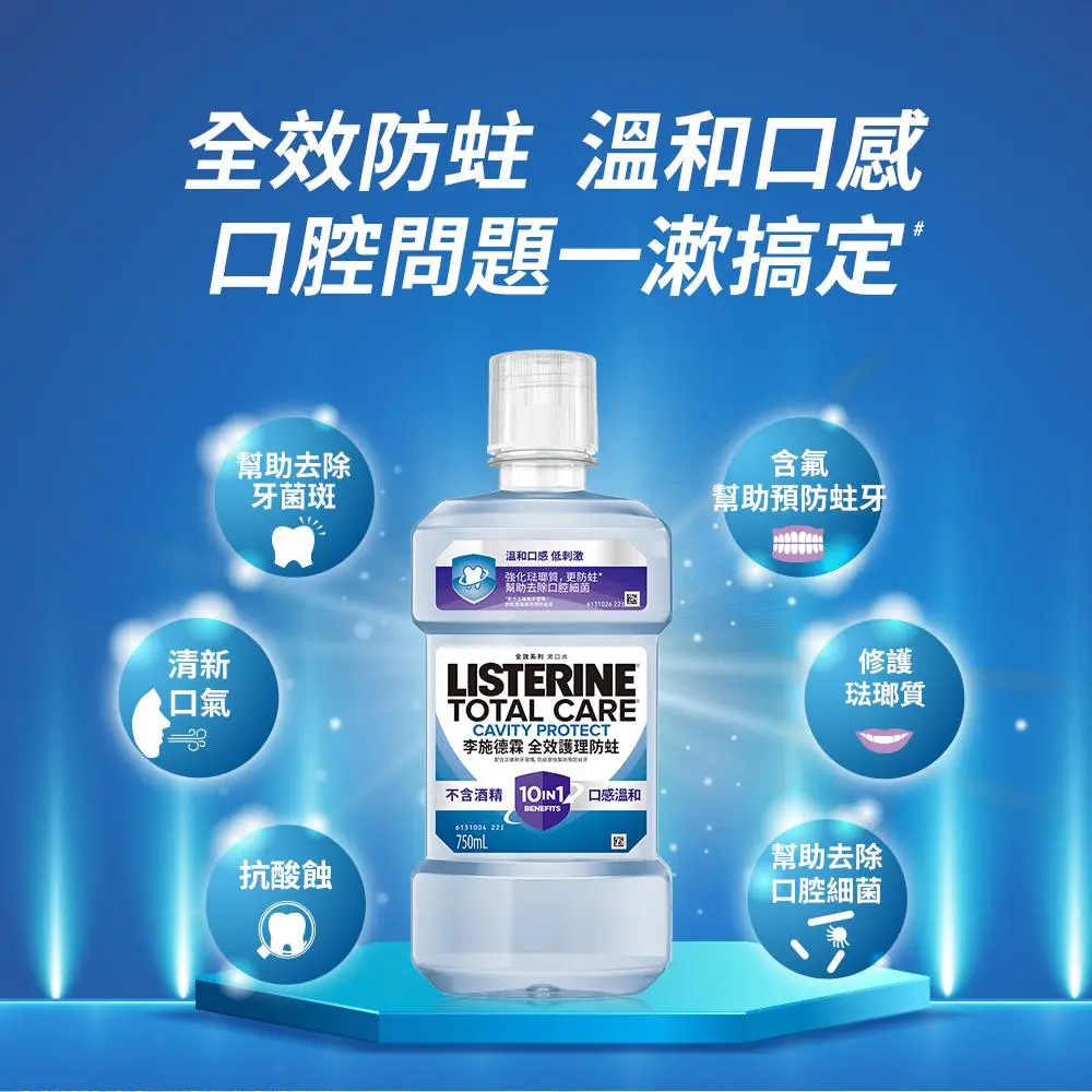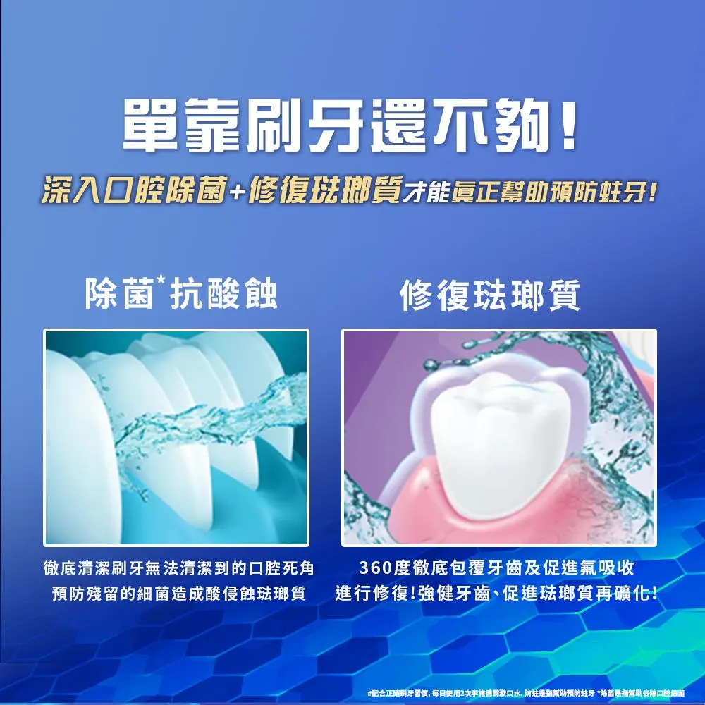 配合正確刷牙習慣。十效合一 1. 防蛀是指幫助預防蛀牙 2. 強化琺瑯質 3. 含氟配方強健牙齒 4. 抗酸蝕 5. 幫助去除牙菌斑 6. 幫助去除口腔細菌 7. 清新口氣 8. 清潔牙齦線以下 9. 清潔牙間隙縫 10. 全口清潔。無添加酒精。