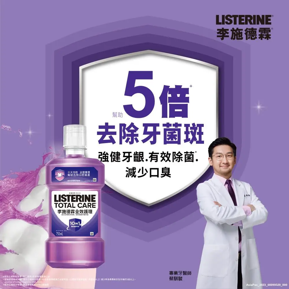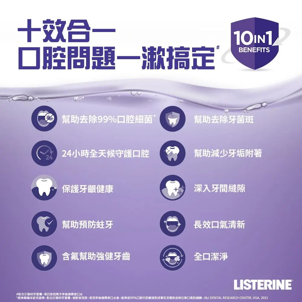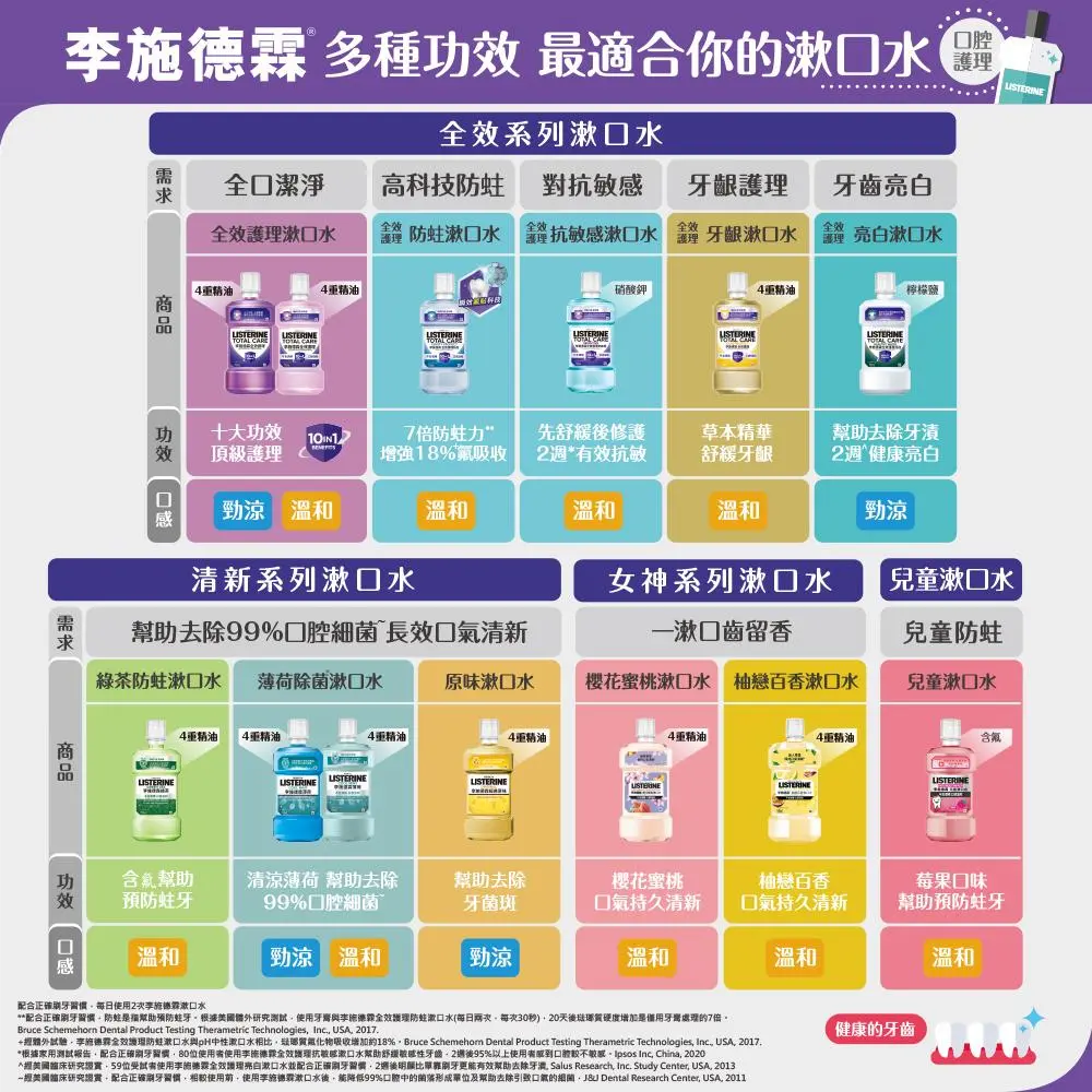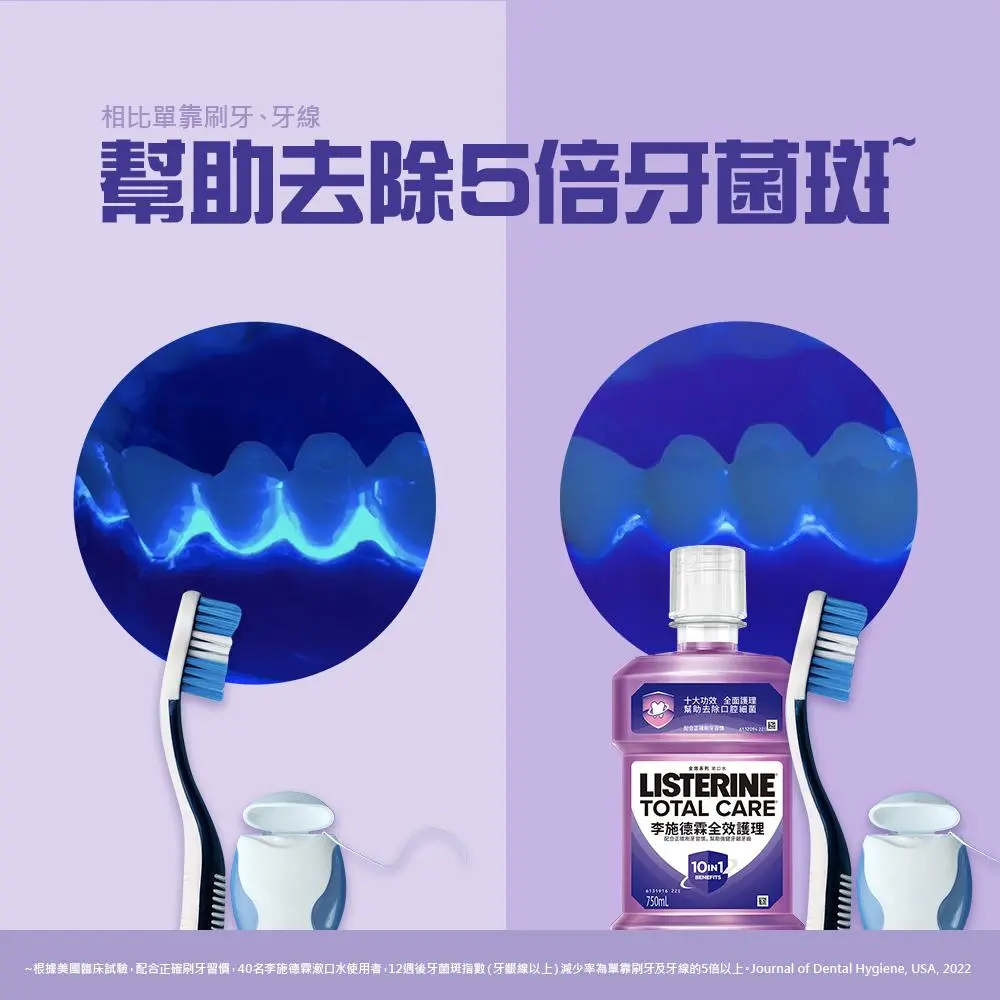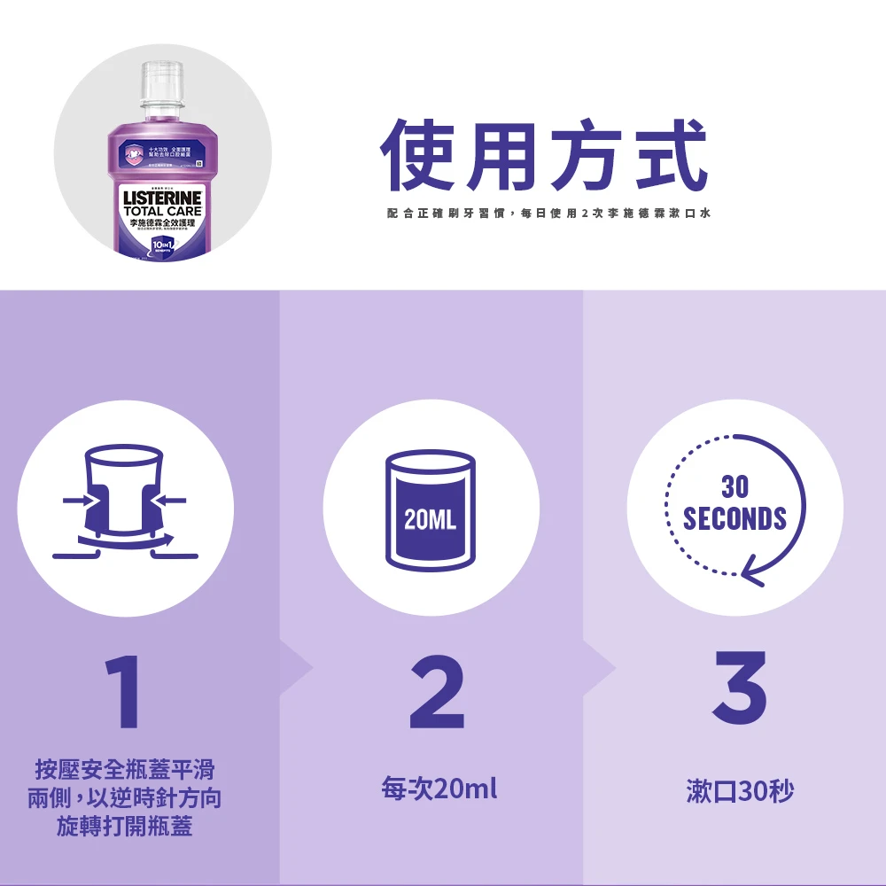 每天早晚刷牙後使用,可全天候保護口腔全面潔淨。李施德霖全效護理配方多添加氯化鋅,能幫助減少牙垢附著,回復牙齒自然潔白含氟化鈉,幫助預防蛀牙特有的4種精油配方,能深入口腔幫助去除牙菌斑,幫助預防蛀牙及牙齦問題幫助去除99.9%*口腔細菌,口氣清新